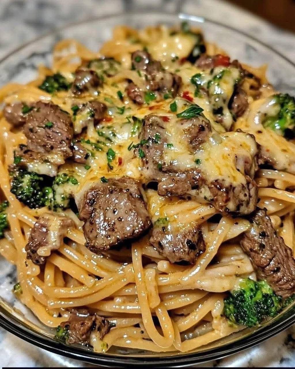 Creamy Steak & Baby Broccoli Alfredo Spaghetti